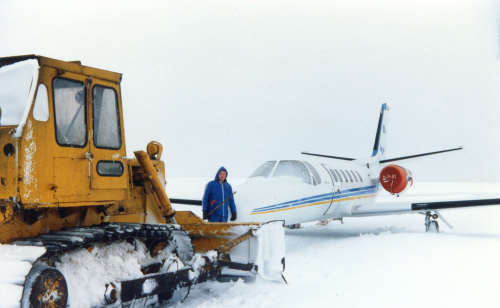 Flugvélin var bundin við jarðýtu og snjóaði í kaf í Kulusuk.