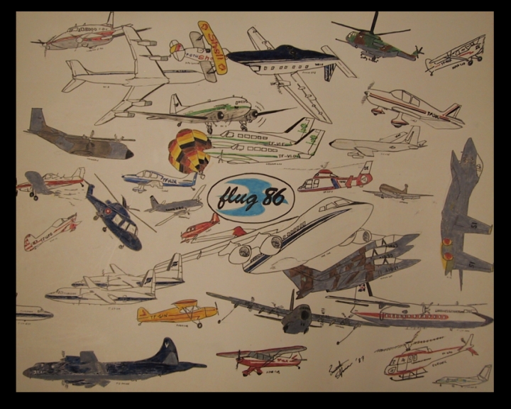 Síðan keypti ég TF-ESS, Cessna 310 sem myndin hér að ofan er af, tekin af Baldri Sveinssyni.Ég var í stjórn Flugmálafélagsins og Flugsögufélagsins mörg ár, en þá var mikil gróska í einkafluginu. Árið 1986 skipulagði ég flugsýningu á Reykjavíkurflugvelli og reyndar aðra sýningu nokkrum árum síðar. Árið 2001 fundust gamlar upptökur af sýningunni frá '86 og ég útbjó DVD sem var sýnd á Hótel Loftleiðum fyrir húsfylli í nóvember það ár. Myndin fyrir neðan eru af málverki sem Sæmundur Stefánsson teiknaði eftir sýninguna .