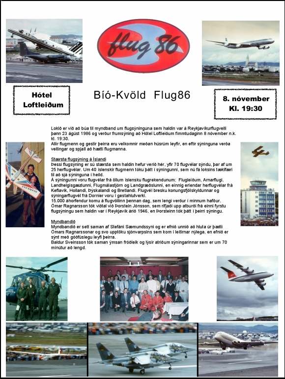 Þetta var stærsta flugsýning sem haldin hefur verið hér, yfir 70 flugvélar sýndu, þar af um 25 herflugvélar. Yfir 40 íslenskir flugmenn tóku þátt í sýningunni og enn fleiri erlendir flugmenn. Á sýningunni voru flugvélar frá öllum íslensku flugrekendunum; Flugleiðum, Arnarflugi, Landhelgisgæzlunni, Flugmálastjórn og Landgræðslunni, en einnig erlendar herflugvélar frá Keflavík, Hollandi, Þýskalandi og Bretlandi. Flugvél bresku konungsfjölskyldunnar og sýningarflugvél frá Dornier voru í gestahlutverki. Rúmlega 15.000 áhorfendur komu á flugvöllinn þennan dag, sem lengi verður í minnum hafður. Ómar Ragnarsson tók viðtal við Þorstein Jónsson flugkappa sem rifjaði upp atburði frá einni fyrstu flugsýningu sem haldin var í Reykjavík árið 1946, en Þorsteinn tók þátt í þeirri sýningu.