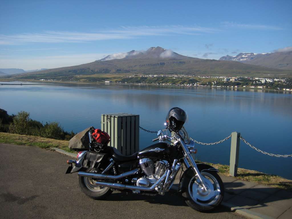 Eyjafjörðurinn birtist í allri sinni dýrð, stórt skemmtiferðaskip í höfninni og spegisléttur sjórinn eins langt og augað eygði. Fallegur útsýnisstaður er í hlíðinni gegnt bænum eftir að komið er inn fyrir Svalbarðseyri, þar staldraði ég við og tók myndir í allar áttir. Tveir þjóðverjar voru þarna nærstaddir og ég bað annan þeirra á minni bestu þýsku að smella einni mynd af mér og fáknum. Vielen dank, auf vieder sehen - og svo geystist ég af stað niður að Enn Einum, sem áður hét Esso.